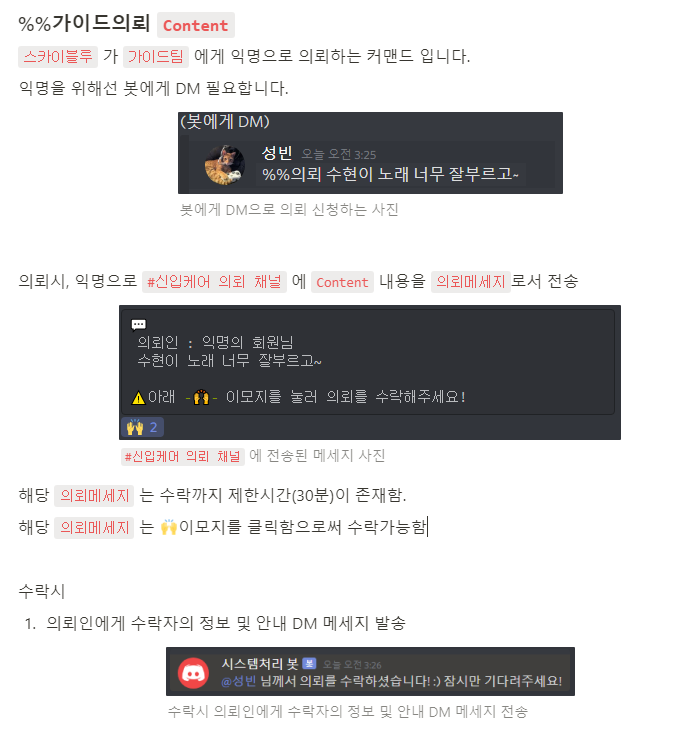 커맨드로 의뢰를 신청하면 특정 채널로 안내 메시지가 가며,