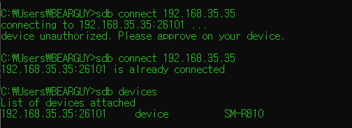 알아보니 Device - wifi - PC 이렇게 무선으로 sdb connect가 된대! 크래들이 없어도 되겠다!