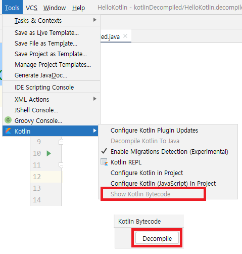 Kotlin 코드와 그 코드를 Java로 Decompile한 코드를 확인가능