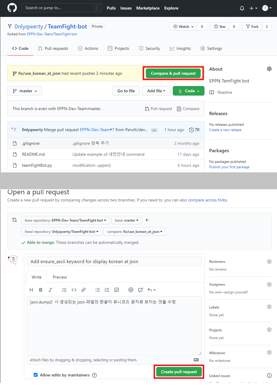 위 사진과 같이 fork 한 repo로 이동시 Compare & pull request 버튼 활성화 되어있음. 클릭하여 Pull Request 생성