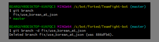 아래 커맨드로 작업 완료된 branch 삭제